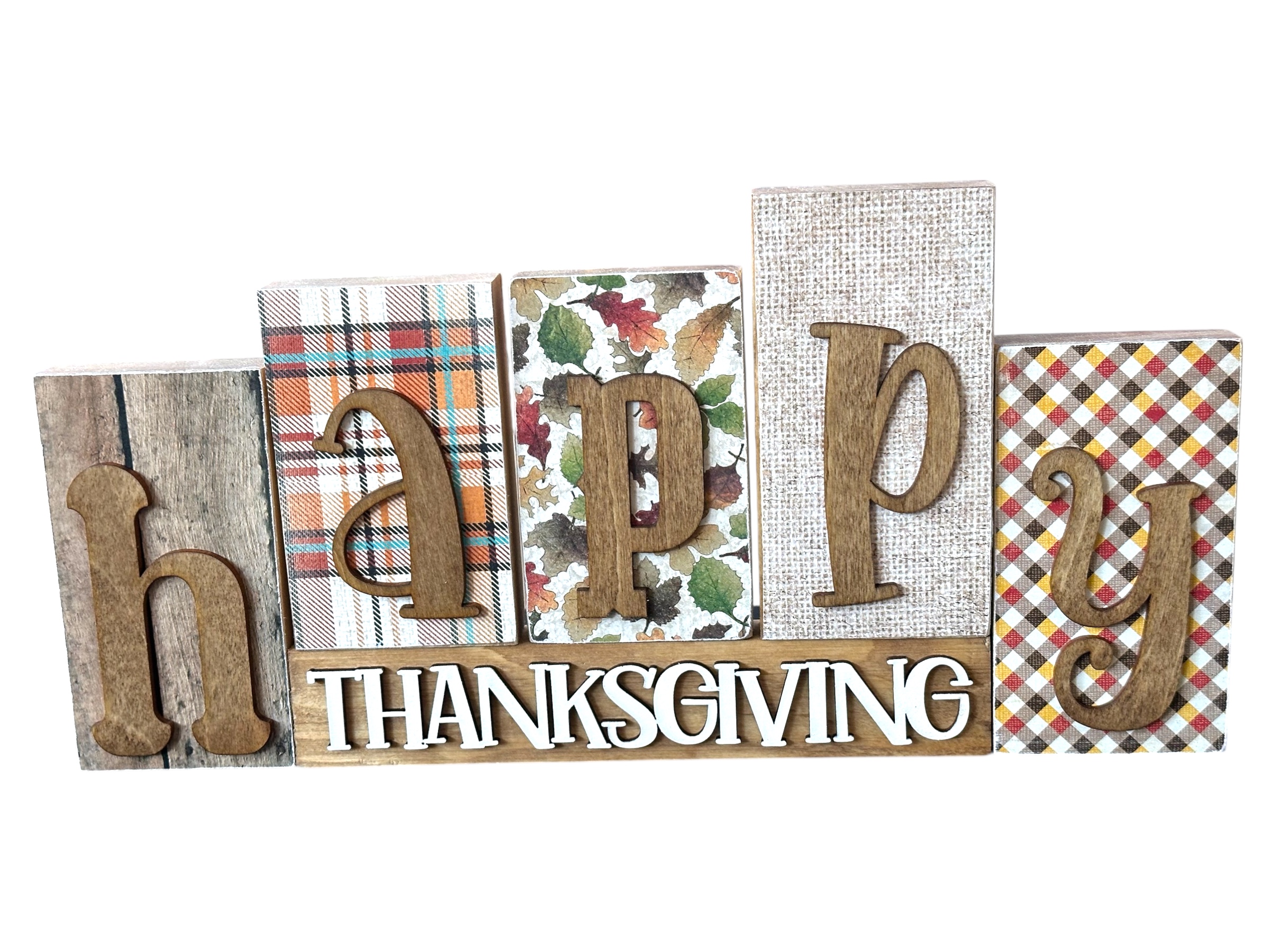 The Thanksgiving side has different autumn-inspired designs with tones like brown, orange, beige and plaid patterns.  The letters spell out “HAPPY” and “THANKSGIVING” is written in bold white letters on a dark background across the bottom.