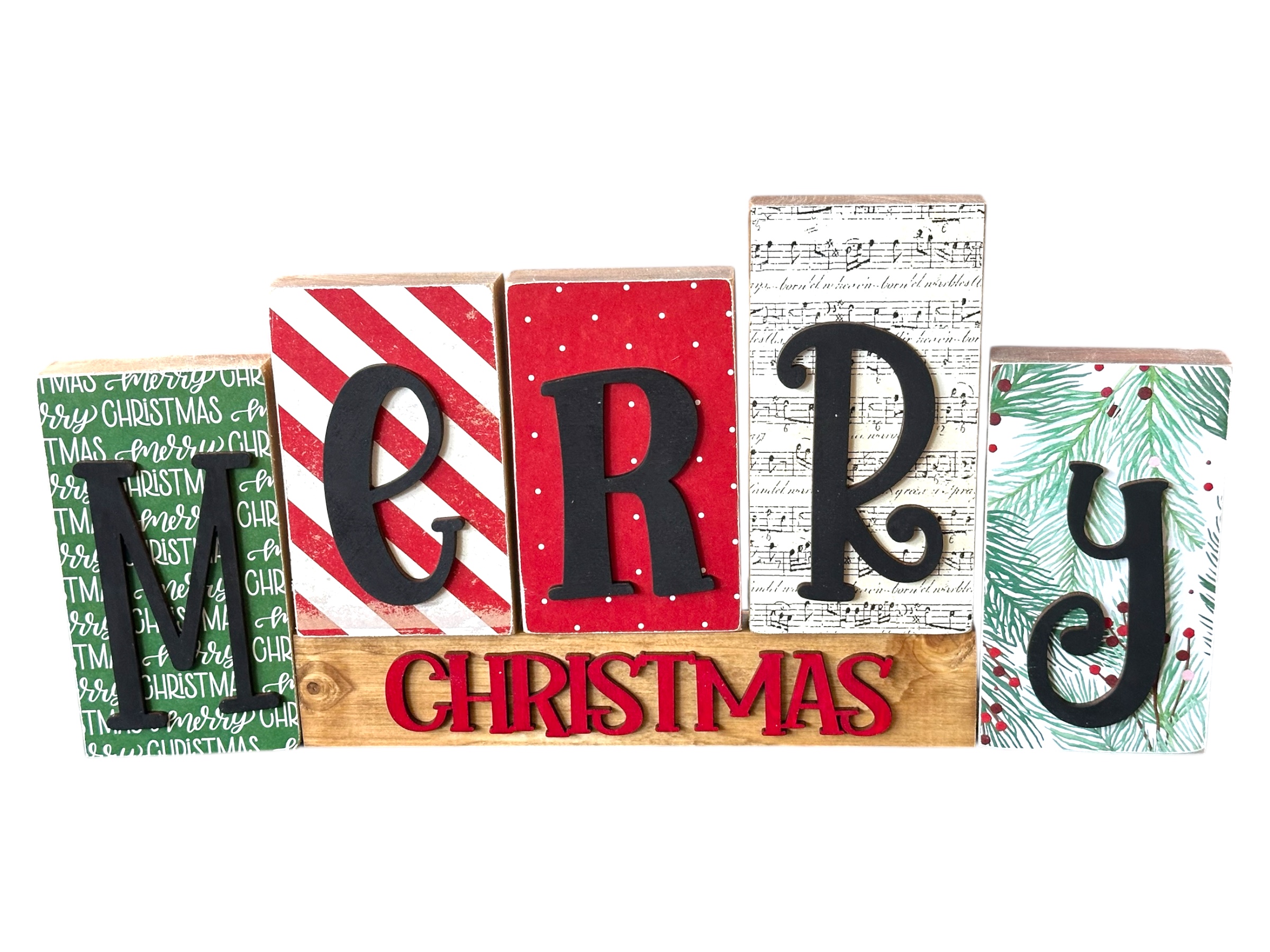 The Christmas side has blocks decorated in red, green, white and black with holiday patterns.  The letters spell out “MERRY” and “CHRISTMAS” is written in bright red letters along the bottom.